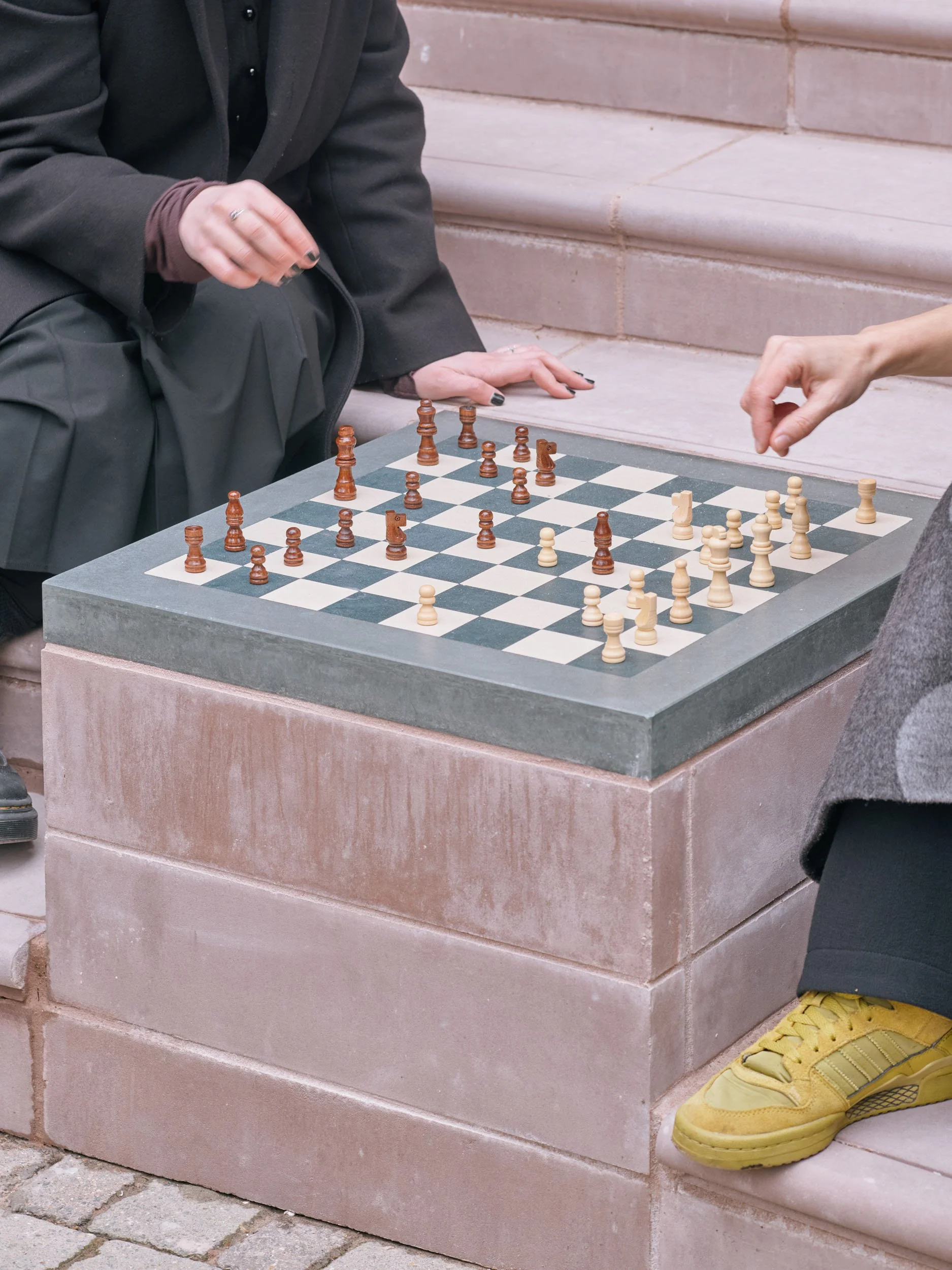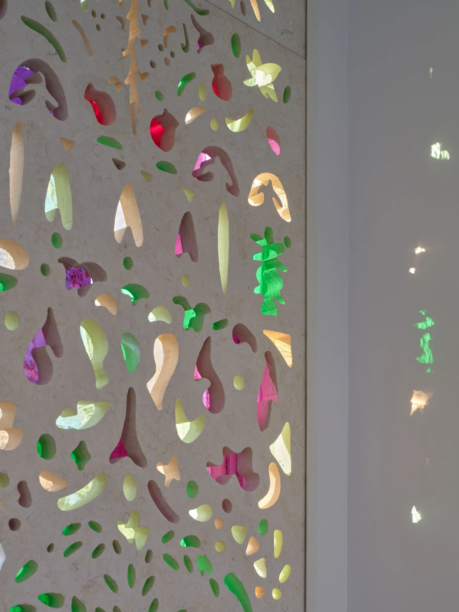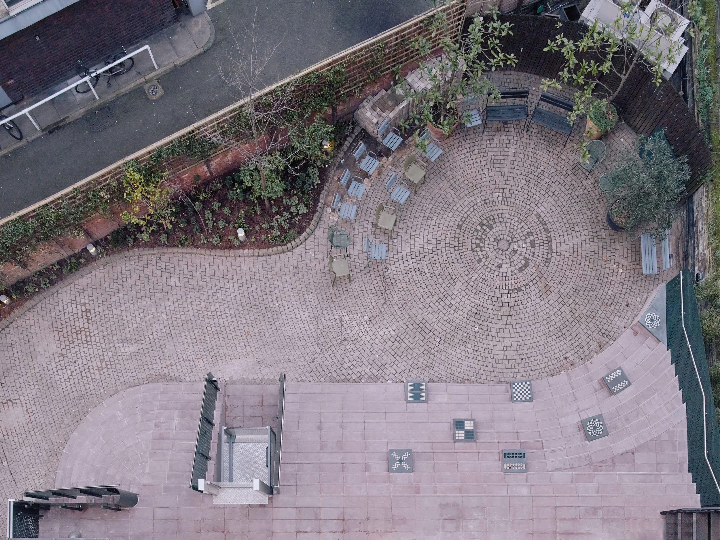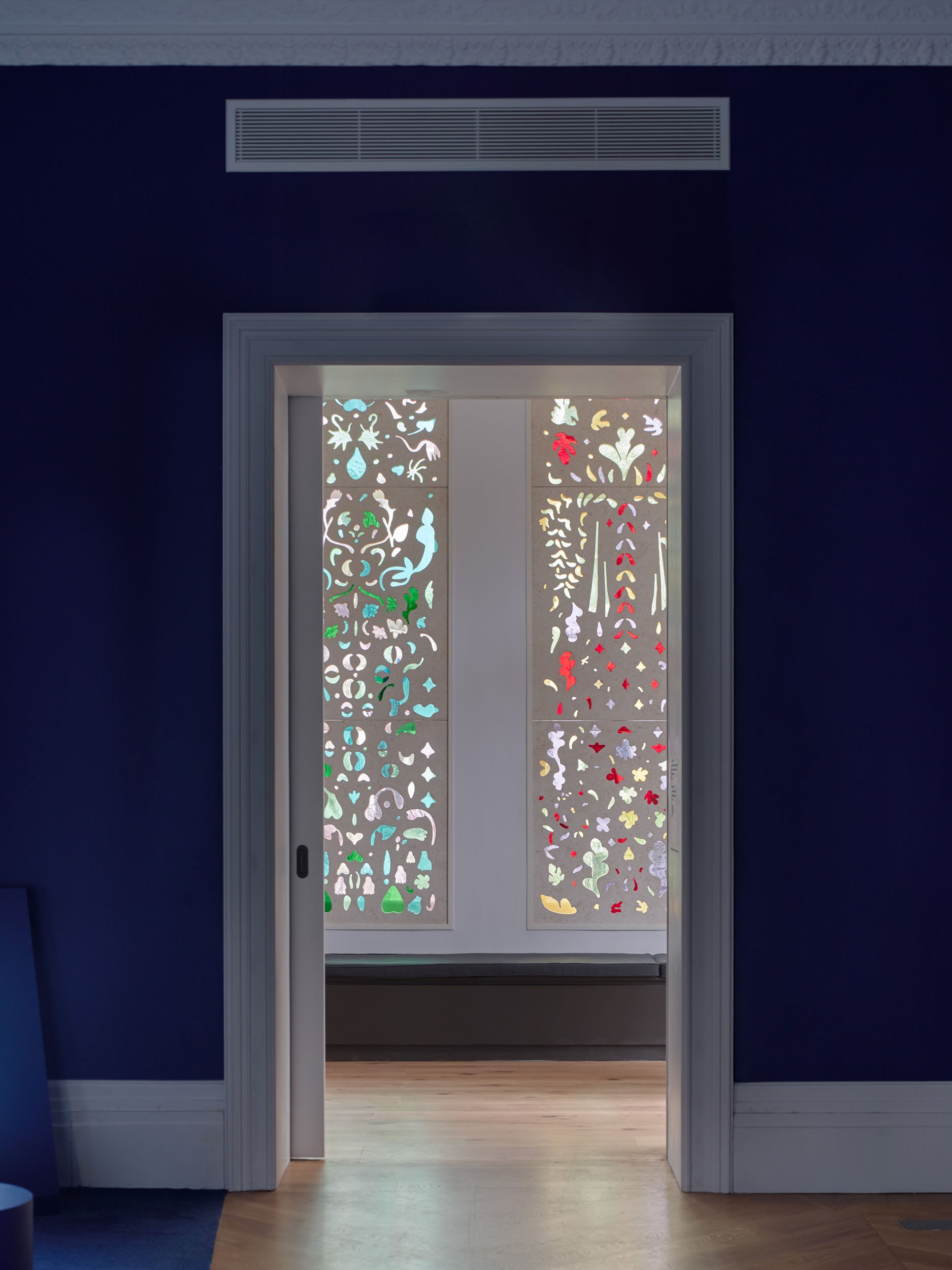 One of the most significant and innovative changes - fully embraced by the client - was the decision to relocate the main entrance to Earl’s Court Road. This allowed us to create a new external arrival space, conceived as a modest yet generous public threshold. Designed to serve multiple purposes, it can function as an informal amphitheatre, a place to gather, or simply a calm garden. The steps are shaped as an amphitheatre and have a series of jesmonite board games integrated within the steps to encourage playing, sitting and relaxing. The games were chosen by the Mosaic Rooms team as a selection of historic board games played often (or originating from) Arab culture. Surrounding the stepped amphitheatre is soft landscaping, designed by Aarde, with a planting scheme that draws on colours inspired by Arabic landscapes, offering visitors a gentle and welcoming moment before entering the building. From this garden, visitors step into a newly formed arrival room, anchored by an artwork commissioned from Dima Srouji, selected by the client to introduce the cultural programme with clarity and purpose.